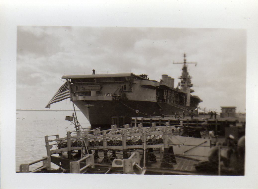 The Ranger, launched in February 1933, was the first ship of the United States Navy to be designed and built from the keel up as an aircraft carrier. Each of its six boilers had its own funnel. Three can be seen on the starboard side in this photo. For flight operations the funnels could be lowered outboard to horizontal. (Know a name? EMAIL page author Don Provost at donprov@optonline.net ) |