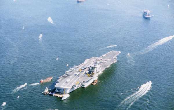 This is USS America, CVA-66, which has just returned from Operation Desert Storm. New York harbor that week was the center of Operation Welcome Home.