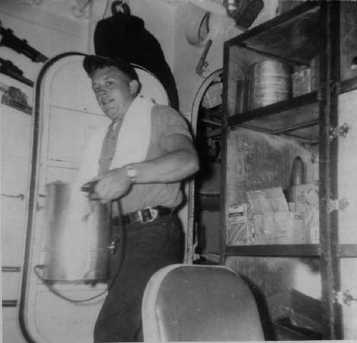 ![]() Arnold Anger on after steering watch. ![]() Walter T. Adams, FT3, carries the coffee pot out of the FT shack. |