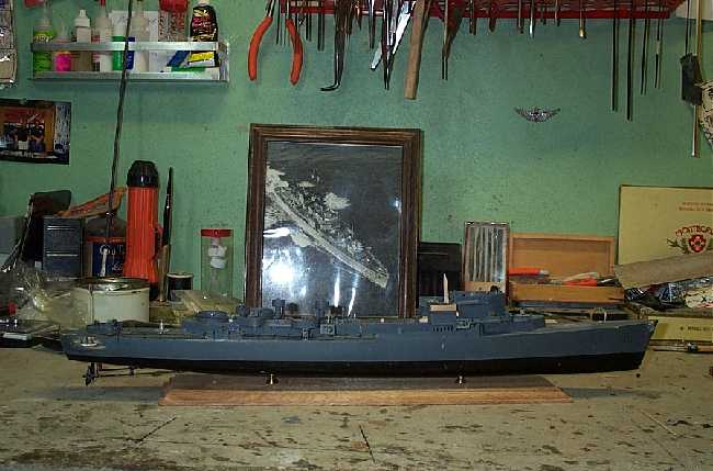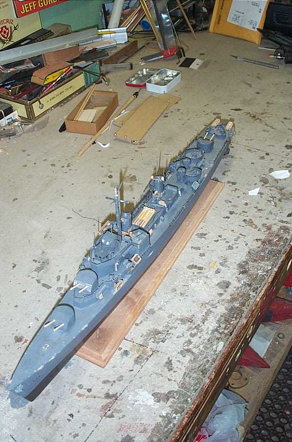 At the Annapolis reunion in 1997 Rich Roberts' (MM3 72-73) made the winning auction bid on an unassembled model of USS Gearing. It was the kind of model that requires great wood carving skills and much detail work and Rich took on the job. Just a year later, at the Savannah reunion, he presented the finished model to the USS Gearing Association for display at the reunions. But after five years of serious travel... to Albuquerque, DuBuque, Las Vegas, Cleveland and Norwich, USS Gearing had taken a beating from the shippers. Rich brought the model home for repairs and has provided these photos of the "shipyard availability." Below is the latest work-in-progress photo, taken in mid-January 2004: ![]() Below is an earlier progress report, an email with photos from Connecticut on July 8, 2003: "Tonight its the torpedo tubes and bullwork behind the bridge. Repairs will take just as long as building the model itself because I have to make a lot of fittings and stuff that fell out of the box, and I have already added a few xtras that were left out. Will be in touch ---Richie" |