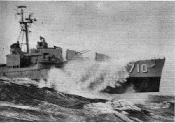 Yes, that is daylight under the bow!! Arnold Anger (GMSN 56-58) scanned this photo from his 1957-1958 cruisebook. It was taken during a storm near the Azores in December 1957. Fuel reserves of ships in company ran very low before the storm eased enough to refuel. |