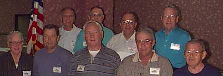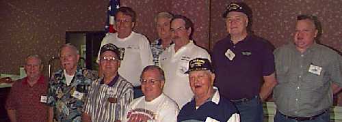![]() | L to R, front: ____?____, Allen Jefferis, CDR (C.O. 69-70), Ken Haworth (TM3 46-45, plankowner) , ____?____, George E. T. Parsons, CAPT (C.O. 45-47) L to R rear: Wally Prince (DC3 56-58), ____?____, Bob Calhoun (MM3 55-59), Carl Lloyd (RM3 45-46, Association President), ____?____. Help ID these faces EMAIL this page author. |