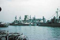 "Tin cans galore."USS Lowry DD-770 is moored on the right. Does anyone recognize this port?? Email the page author. |