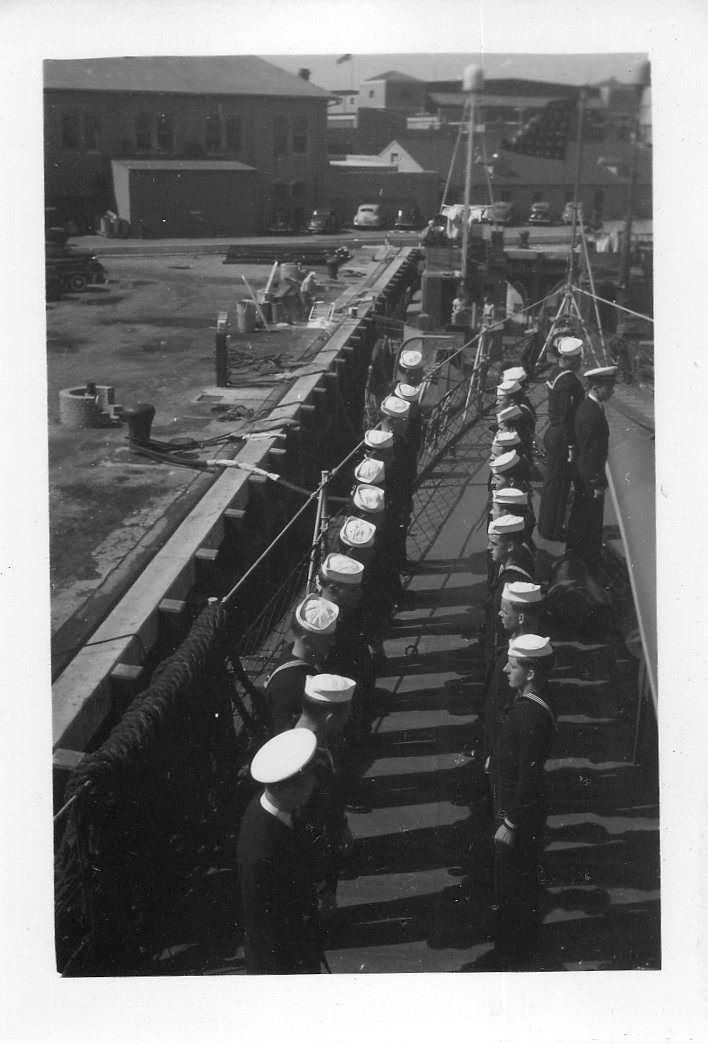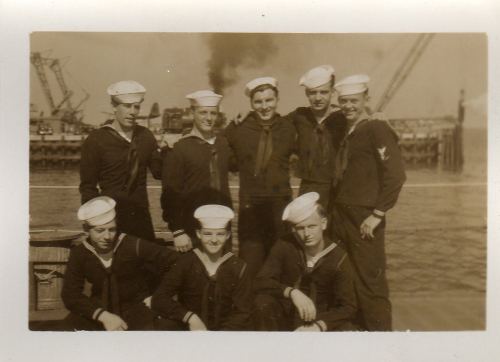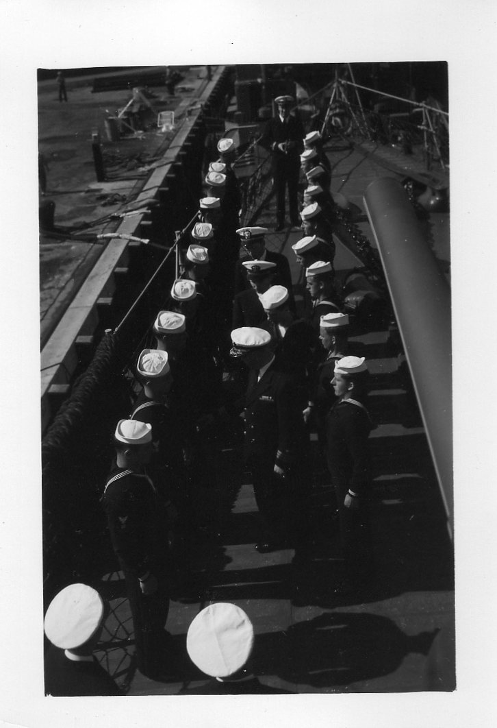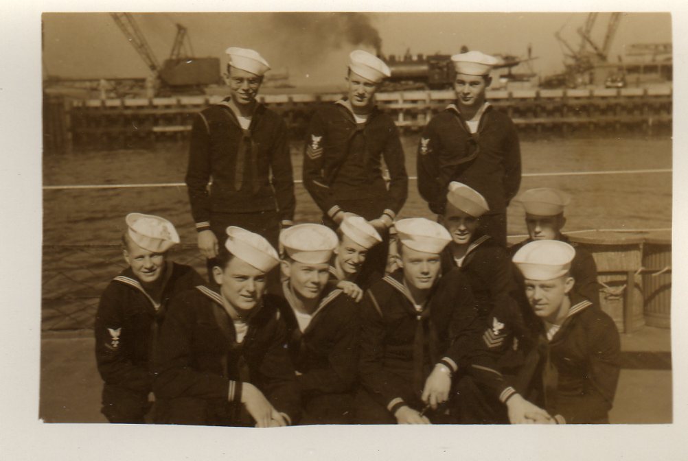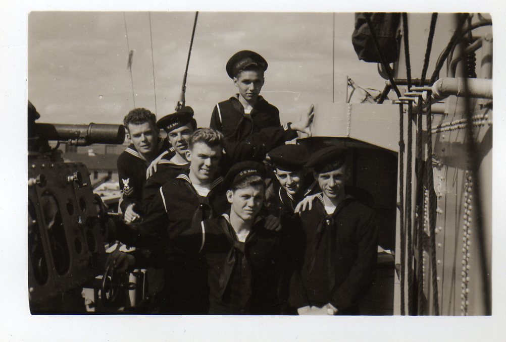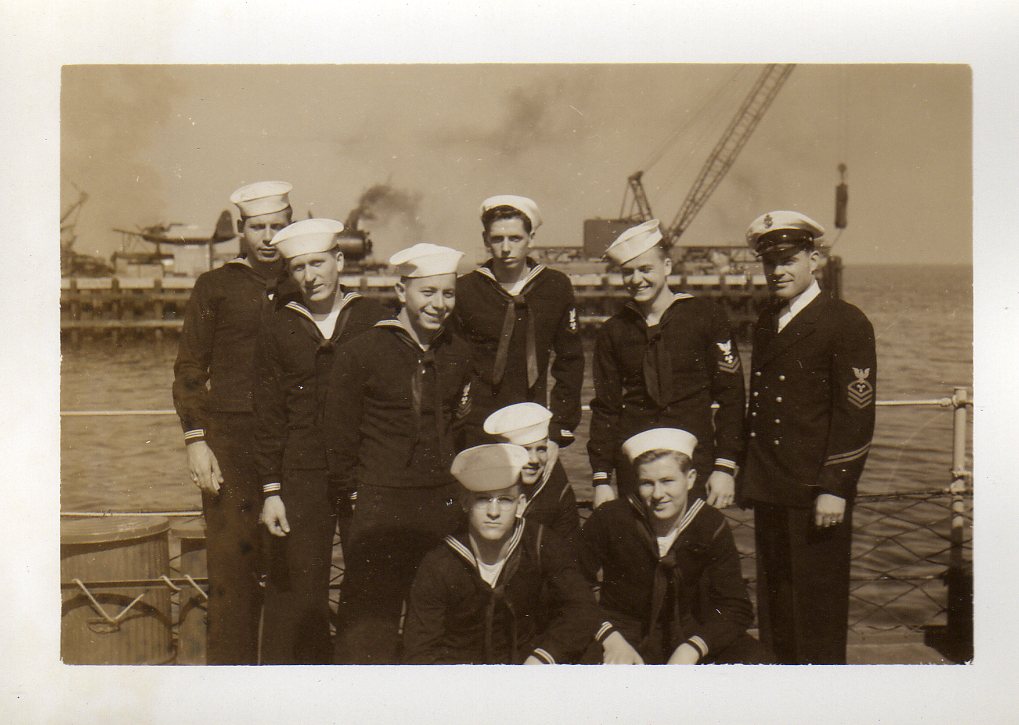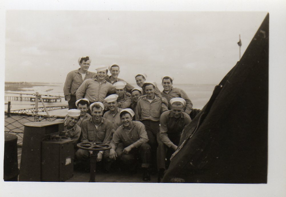 We are grateful to William Tolar, son of Thomas S. Tolar, LTjg 1945-1946, for finding these photos in family memorabilia in 2005, and sharing them with us. Ltjg Thomas Tolar is 7th from the left in the photo (#15) of the officers. Carl Lloyd (RM3 45-46) has recognized that most of the Tolar photos were likely taken at Pensacola in August 1945 where the change of command (Copeman to Parsons) took place. Gearing in its first year also visited Boston, Norfolk, Casco Bay and GTMO. The aircraft carrier in photo #19 is USS Ranger CV-4, which had a distinguished war record in the Atlantic Fleet and was decommissioned in October of 1946. Help is needed to identify the Gearing sailors in these photos. It is likely that most of them are plankowners. We will add captions to the photos as we learn the details. Email this web page editor, Don Provost donprov@optonline.net, with all the information you have! Mention each photo by its number. Photos #2, #3, #4, #5, #9, #13 #14, #15 and #18 have been updated with some names, thanks to Warren Groeneman (SOM2 45-46), Carl Lloyd (RM3 45-46), Dominick Giampietro (MM1 44-46) Art Jackson (RD2 45) and Fred Burkett (BKR2 45) and Ron Stephens, son of Benjamin Henry Stephens (S2c SK 45) and David Sullivan, son of Raymond John Sullivan (S2c 45). |